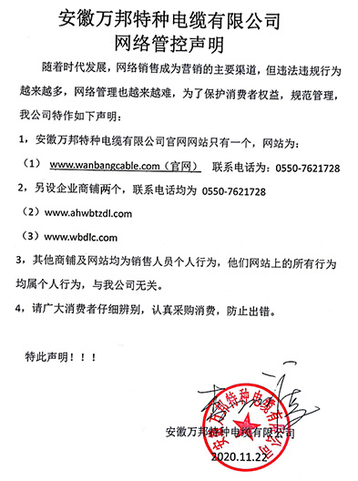 鄭重聲明:安徽萬邦特種電纜有限公司官方網站為:www_wanbangcable_com.zhhbwx.cn,除此之外無任何子網站或合作網站,其余均為假冒偽劣。電話:0550-7621728 13485756353 地 址:安徽省天長市滁州高新技術產業開發區經四路29號